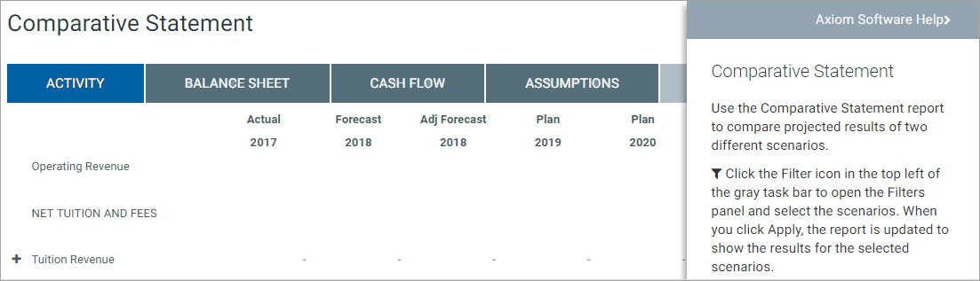 When a help code is specified in the form properties, the help icon in the right-hand side of the Task bar The toolbar that displays across the top of Web Client pages, underneath the Navigation bar. The Task bar provides access to various tasks that are specific to the current area, page, or document. opens a help panel to show the associated help text, instead of opening Axiom Platform Help.