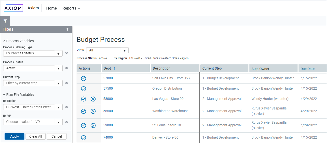 When the Process Directory page is accessed, Axiom Platform reads the variables from the designated file, and presents them in the Filters panel (just like when using refresh variables with Axiom forms). The user's selected values for the variables are applied as filters to the directory.