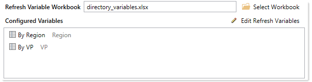 To designate a file as the Refresh Variable Workbook, click Select Workbook on the Process Directory tab. You can select any utility file for the file group. Once a file has been selected, the variables defined in that file display in the Configured Variables box for your reference. If you want to edit the refresh variables, clicking Edit Refresh Variables opens the file.