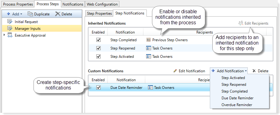 NOTE: If multiple instances of the same notification type apply to a step, then each instance will be sent when the notification is triggered. For example, if a step has an inherited Step Activated notification as well as a custom Step Activated notification, then both notifications will be sent (unless one of the notifications is disabled).