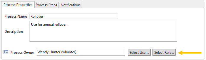 The owner of the process is designated by the Process Owner setting on the Process Properties tab. By default, the process owner is set to the user who created the process definition. If desired, you can change the owner to a different user or to a role by clicking Select User or Select Role. If the owner is a role, then all users in that role are treated as process owners.