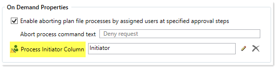 You can optionally specify a process initiator column for the process. If you designate a process initiator column, then the process initiator will be set to the user in the column when the plan file is activated in the process.