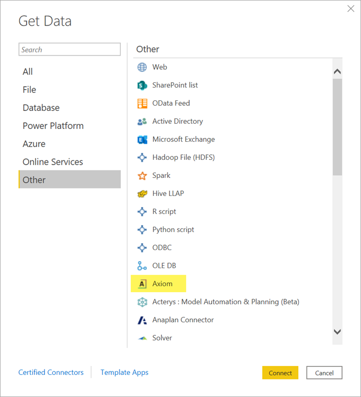 In the right-hand column, select Axiom. Note that you may need to scroll the list to find it, because the list of “other” connectors is not sorted alphabetically. Alternatively, you can type “Axiom” into the search box at the top of the dialog to find the connector.