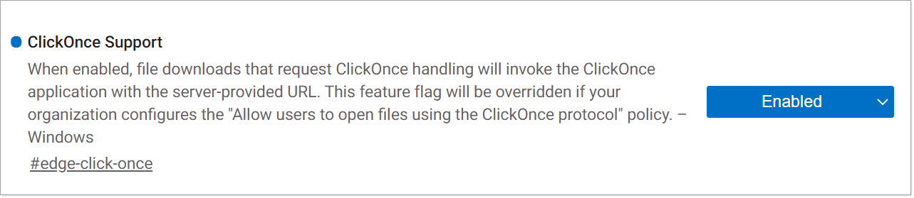 If you are using Microsoft Edge, you can enable ClickOnce support in the browser configuration settings as follows: