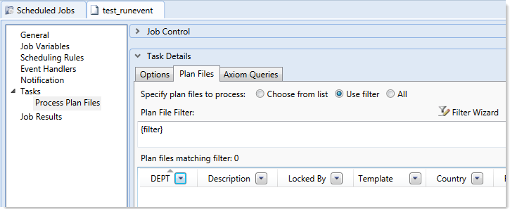 When the job is executed by use of this RunEvent function, the value DEPT.Region='North' will be placed in the Plan File Filter box of the Process Plan Files task, and the job will be run using that filter.