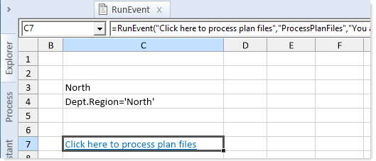 =RunEvent("Click here to process plan files","ProcessPlanFiles","You are about to process plan files for the "&C3&" region. Do you want to continue?",,"filter = "&C4)