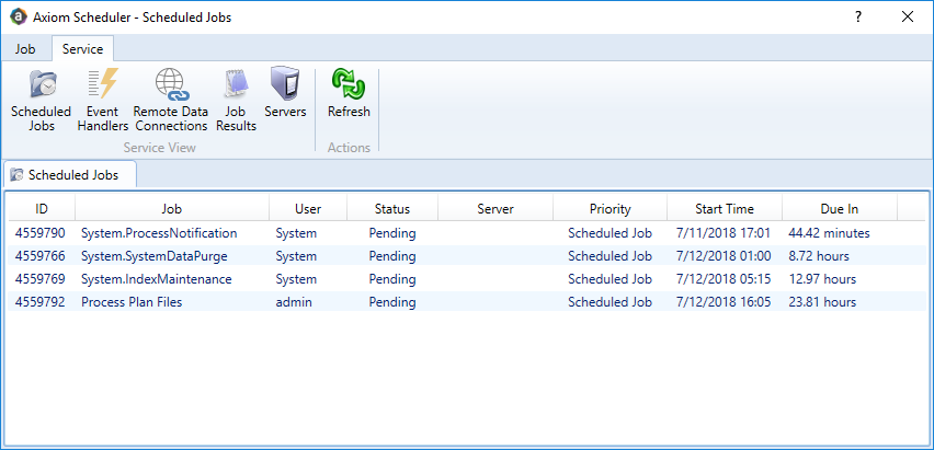 • On the Service tab, you can manage scheduled jobs, view job results, and perform other Scheduler management activities.