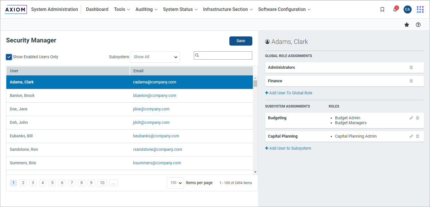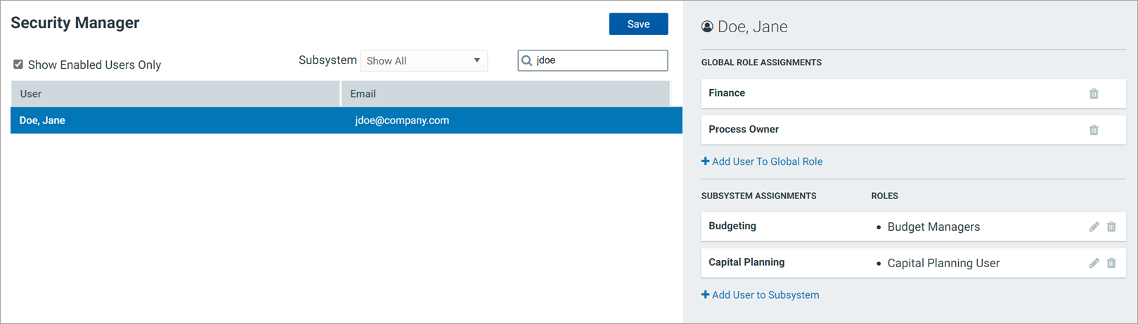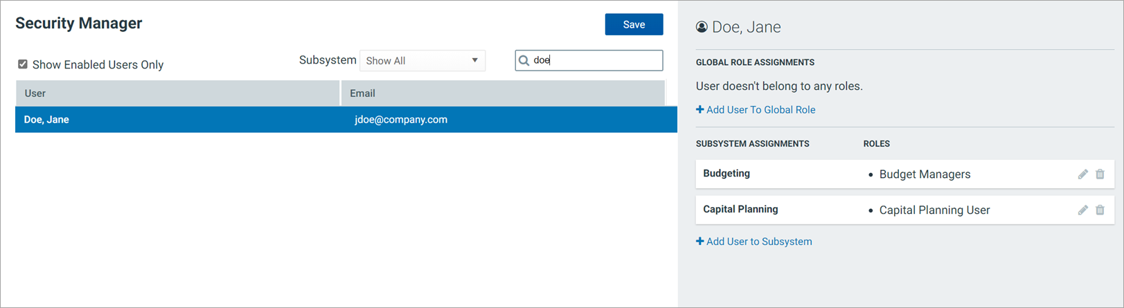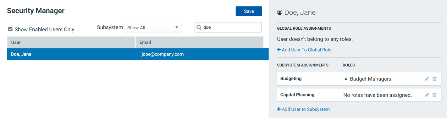 Remember to click Save after making any modifications to subsystem and subsystem role assignments.