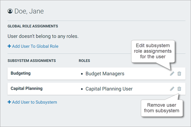 • To remove a user from a subsystem: Click the trash can icon on the subsystem to remove the user from the subsystem. The user is also automatically removed from all of the subsystem's roles.