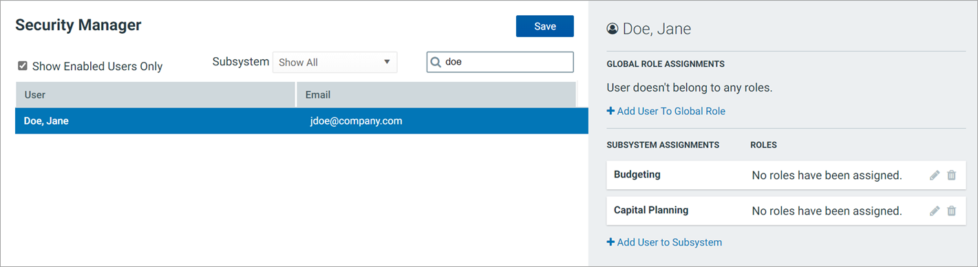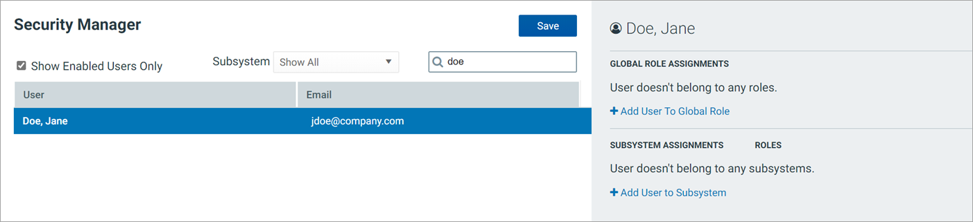 After you select a user, that user's current role and subsystem assignments display in the right-hand pane. In the following example, the user does not belong to any global roles.