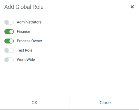 3. In the Add Global Role page, select the toggle switch next to the roles that you want the user to be assigned to, and then click OK. If the toggle switch shows green, the user is assigned to that role.