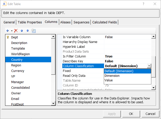 The Column Classification can be viewed and edited in the Edit Table dialog, on the Columns tab. Columns using the default classification are set to Default, with the name of the default classification for the current column in parentheses. If you want to override the default classification, you can set the column to either Dimension or Value directly.
