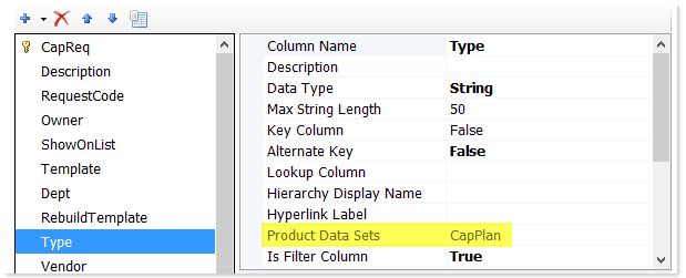 Product data sets are defined as part of table management activities. Within the Edit Table dialog, you can assign columns to existing product data sets, and you can create new data sets. When you create a product data set, you define a name to describe the collection of columns and you specify which columns belong to that data set. Typically the data set name is a version of the product name, such as Budget or CapPlan.