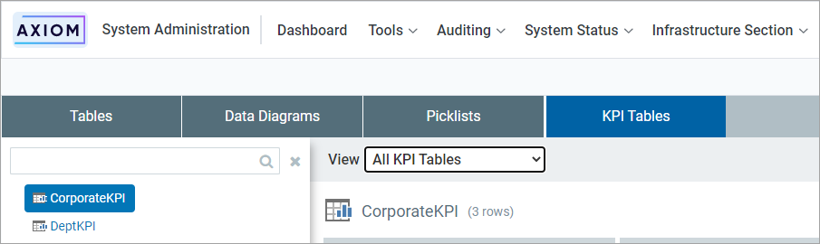 In the KPI Tables tab, the left-hand pane displays the list of KPI tables in your system that you have rights to see. You can view this list using the following View options: