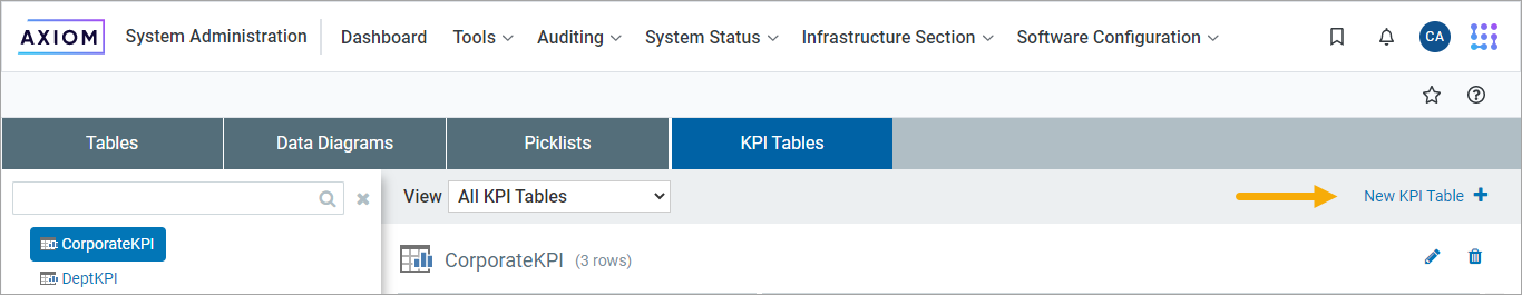 You can create new KPI tables as needed. Only administrators and users with the Administer Tables security permission can create new KPI Tables.