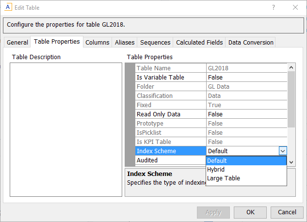 Index schemes are specified in the table properties. You can set the index scheme when creating a table, or when editing a table. However, if you want to use the Large Table index scheme, this must be specified when the table is created. After a table is created, it is not possible to change Default or Hybrid to Large Table, or vice versa. If necessary, you can clone the table and change the index scheme as part of the clone.