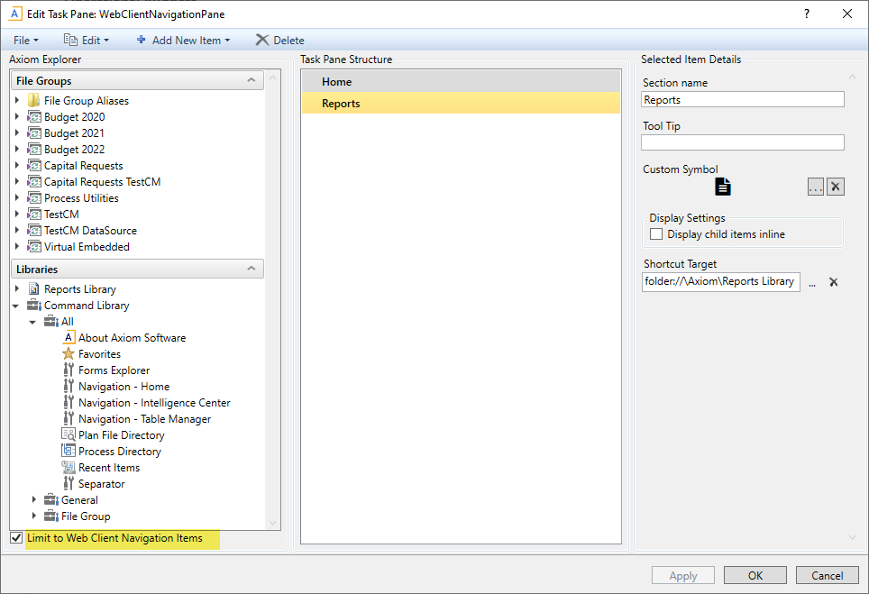 Web navigation links are defined using task pane files. When working in a file that is intended to be used for web navigation, make sure to enable the setting Limit to Web Client Navigation Items, located at the bottom left of the Edit Task Pane dialog.