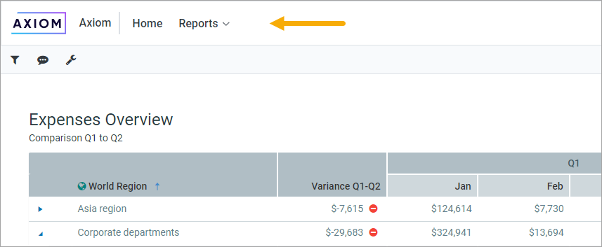 - Reports: Navigate to the current user's web-enabled reports (Axiom forms or web reports), grouped by folders in the Reports Library. Only folders with web-enabled reports will display.