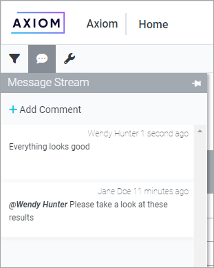 The ability to view and add comments is only available if the Message Stream is enabled for the document. For more information, see Enabling or disabling the message stream for Axiom files.