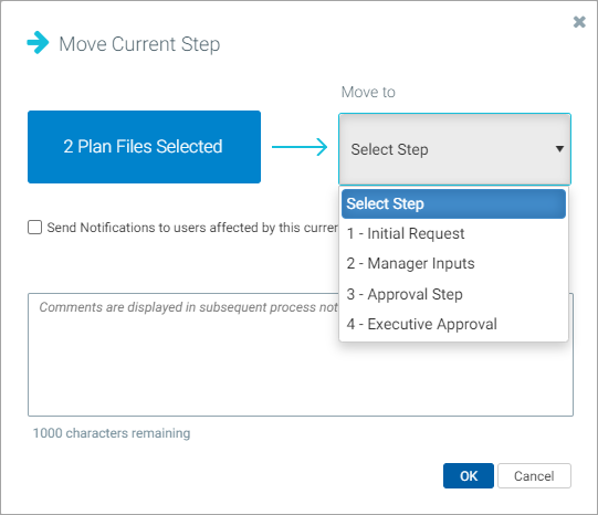 To send notifications to the new step owners for the target step, select Send notifications to users affected by this current step change. When you select this check box, you can also enter a comment to include in the notification and store with the process. By default, notifications are not sent to new step owners when moving plan files to a different step.