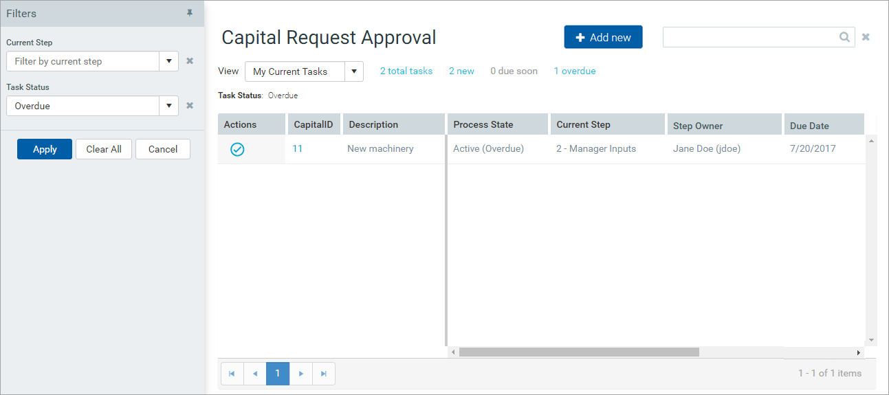 Task Status: Show your current tasks based on task status, such as whether the task is new, due soon, or overdue. By default, the view shows tasks in all statuses. However, if you navigate to the page from the Process Summary component, the view is automatically filtered based on the header you clicked. For example, if you clicked "3 due soon," the view is filtered to show only the due soon tasks.