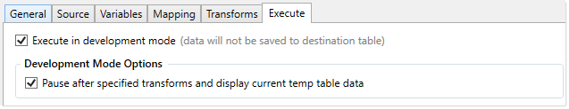 IMPORTANT: When an import is run in development mode, all of the steps in the Transforms tab are performed, including any steps that modify tables other than the temp table. If you do not want these steps to occur during testing, then you should disable the step on the Transforms tab before executing the import in development mode.