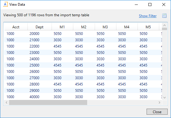 By default, the View Data dialog shows the first 500 rows of data in the temp table. This row limit is controlled by the ETLMaxRows system configuration setting. If desired, you can filter the data to make it easier to find specific records you might be looking for. To do this, click Show Filter in the top right corner of the View Data dialog. This enables the following filter options for the dialog: