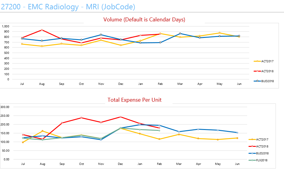 - Total Expense Per Unit chart - Compares the department’s total expense per key statistic amounts by month for current year actual, current year budget, last year actual, and current year flex budget (if used)