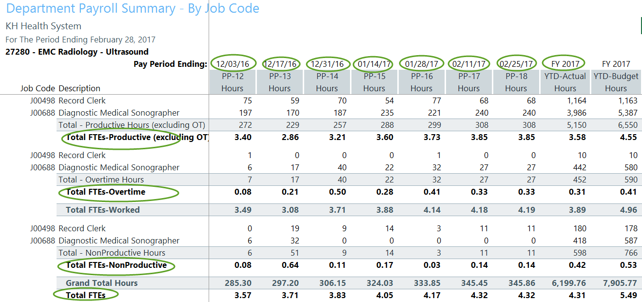 The Pay by Job Code (JC) report contains Hour and FTE information by individual Jobcode , including recent individual pay periods and year-to-date.
