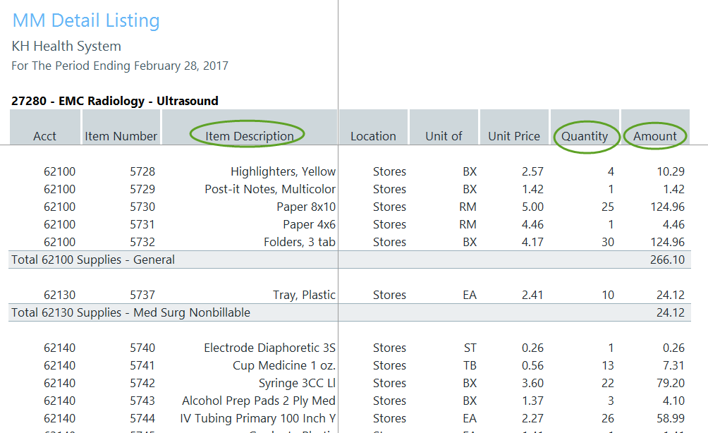 The Materials Management Distribution report (MM) comes directly from the inventory system (store room) and provides transaction detail items pulled from inventory including Item Description, Quantity, and Amount.