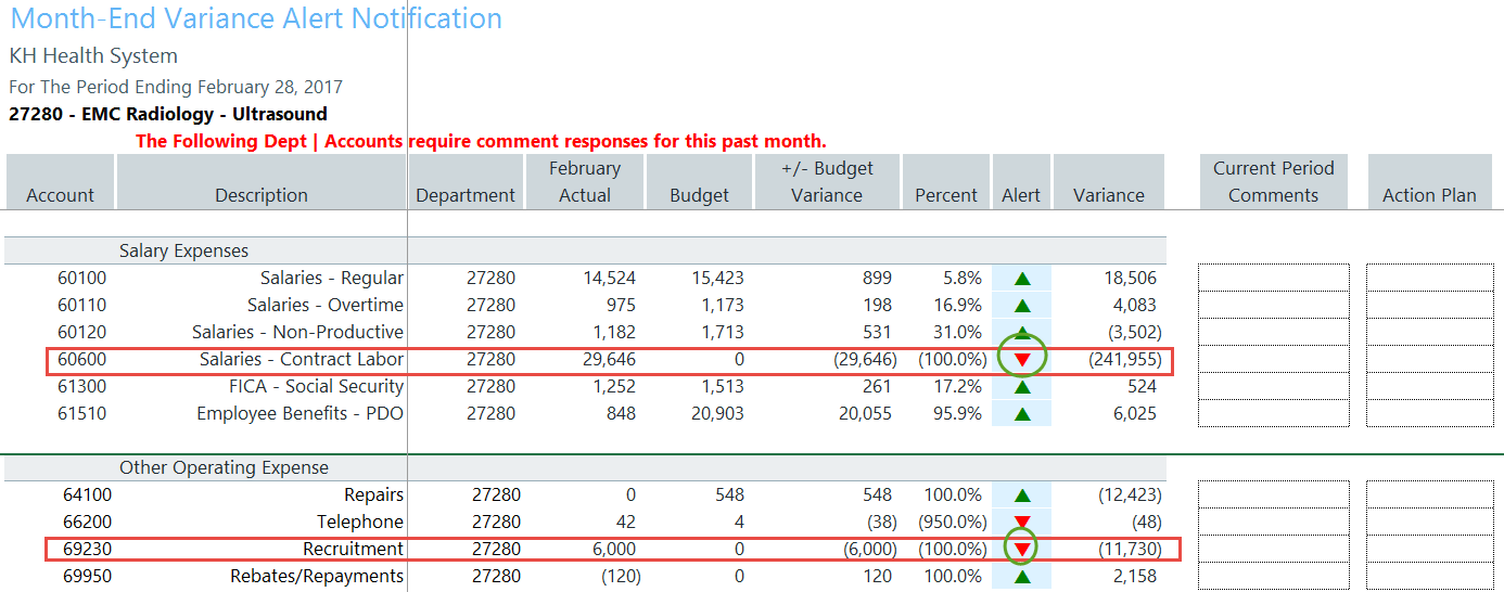 Review the Summary Level information, then look to the detail for further explanation regarding variances. Determining the account numbers with variances will provide the link to the detailed information on the AP, AR, MM, etc. reports that support the expense. As in our example above, Salaries and Other Expenses resulted in a Red Flag Variance, specifically within accounts 60600 Salaries-Contract Labor and 69230-Recruitment.