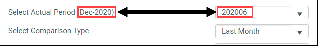 NOTE: When you select an actual period, the month and year that the period represents display in parentheses next to the drop-down list name. In the following example, the selected period is the sixth period in the fiscal year, which is December 2020.