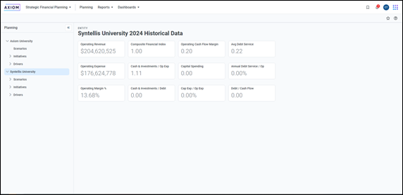 Previous versions of Strategic Financial Planing (SFP) limited institutions to a single entity of type “University." This process meant that plan data for all departments and initiatives included in a scenario followed a single data flow through all tabs within a scenario and arrived at a single balance sheet. Additionally, initiatives and drivers were globally available to all scenarios.